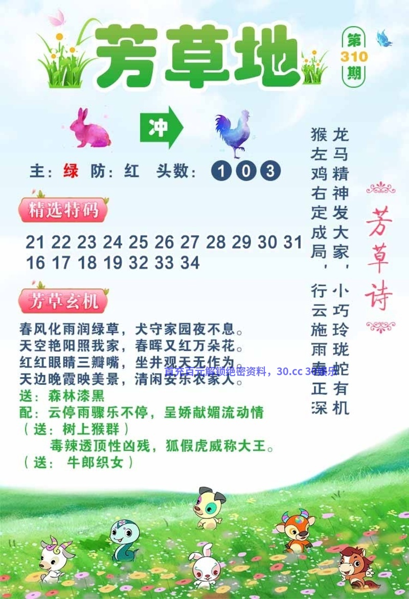309期芳草玄机:兔蛇庆生犬守门,接二连三风雨后。天赐王恩蛇马舞,龙猴莫问出家人。顺藤摸瓜蛇缠马,分合天下本一家。一道天机兔猴午,几度风雨几度秋。 芳草诗:一帆风顺蛇虎午,沾亲带故取蓝红。色心色面双面人,天下凶残三四开。 传奇特肖:马蛇兔龙鸡鼠羊 发财波色:红绿 内幕头数:430 |